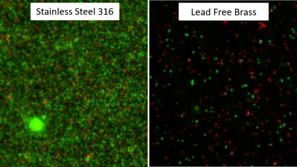 In particular, the uptake of replacement materials such as stainless steel and various polymers (e.g., Acetal, Polypropylene, Nylon) in place of leaded brass (which is known to present antibacterial properties) may result in increased risks of water system contamination by opportunistic premise plumbing pathogens (OPPPs) such as Legionella sp., Pseudomonas sp. and non-tuberculosis mycobacterium.