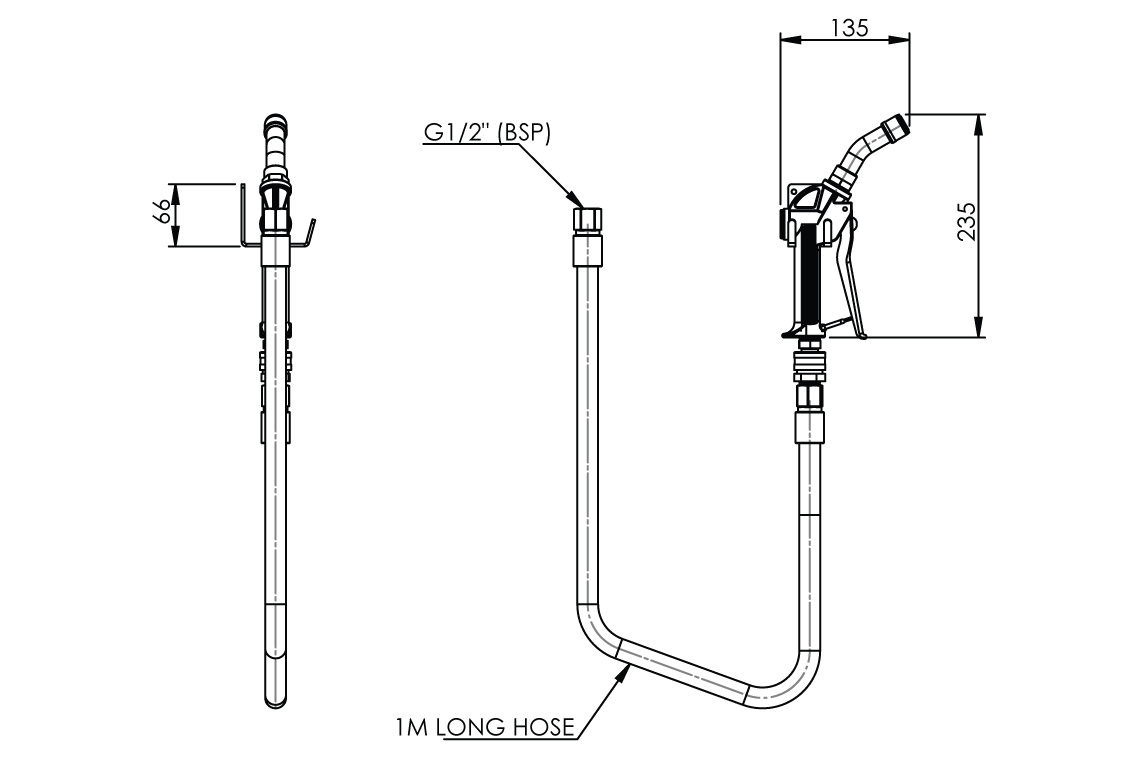 - Heavy duty flexible hose with stainless steel swivel fittings on both ends