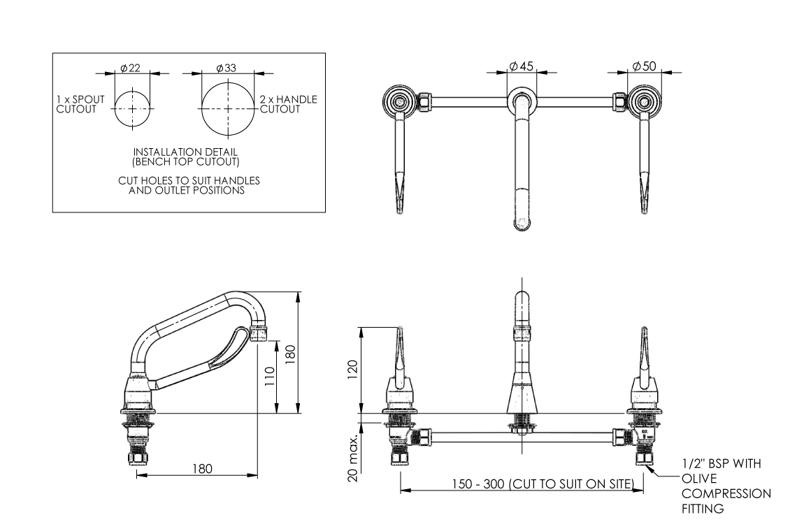 - 3 Star WELS (8 L/min) aerator supplied standard. 5 Star WELS (6 L/min) aerator available on request - specify when ordering