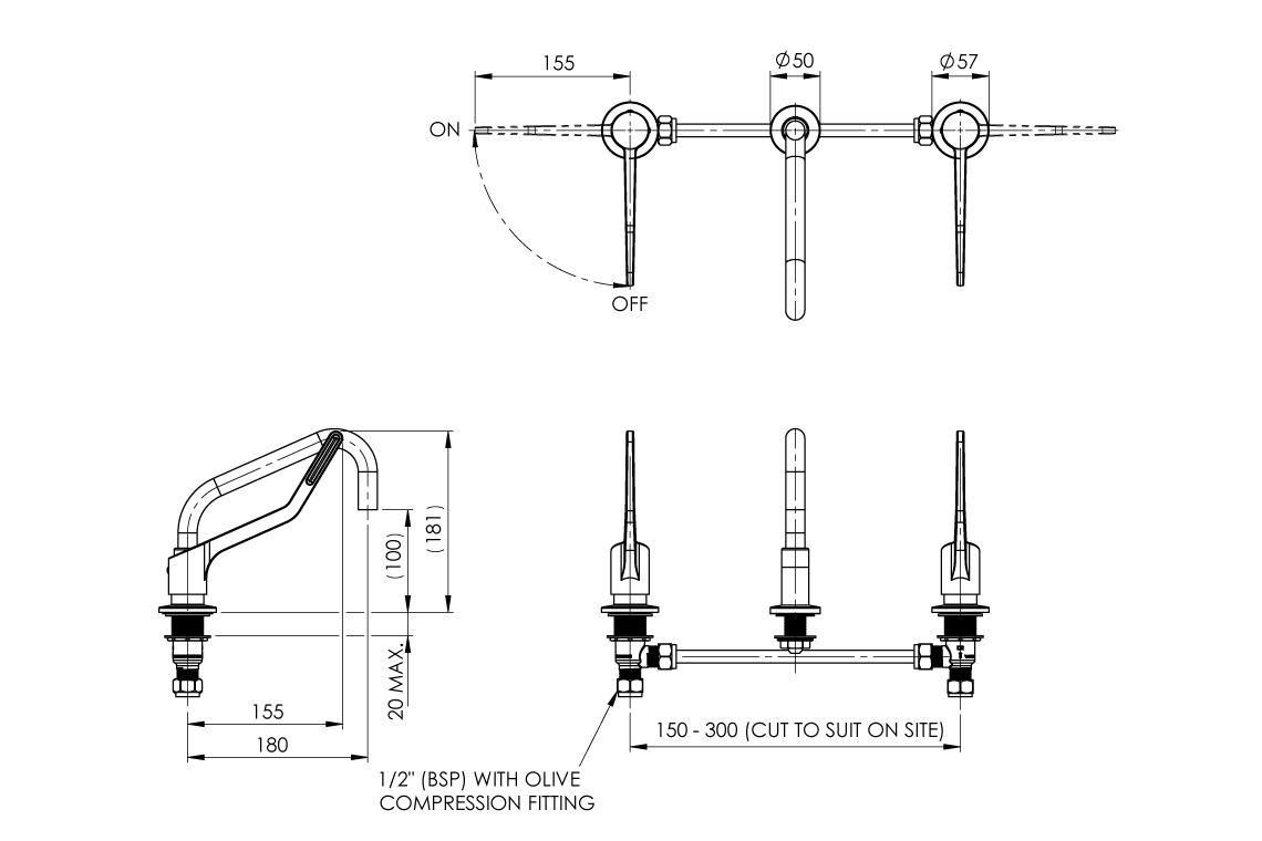 - Quarter-turn, contra-rotating 150mm lever handles