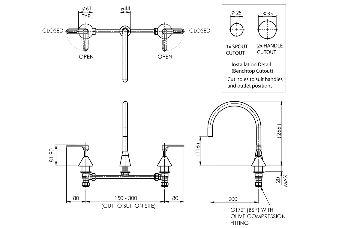 - 200mm long reach concealed aerator spout capable of being fixed or swivel