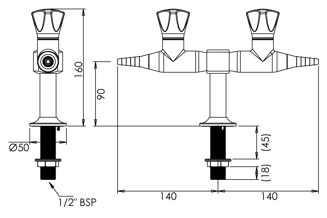 Slimline Two Way 180 Degree Bench Mounted Laboratory Tap (Dry Media)