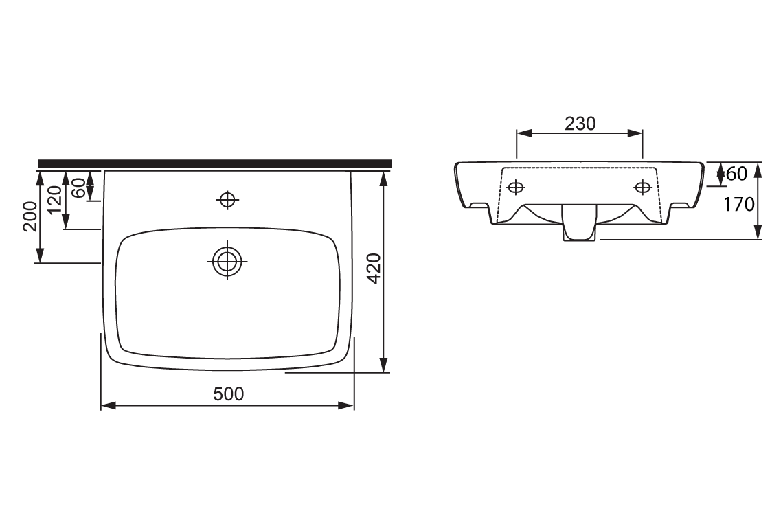 Contemporary and versatile European made rectangular wall mounted 500mm wash basin with large bowl and generous layoff area at rear. Suitable for AS1428.1 applications. Optional shroud available.