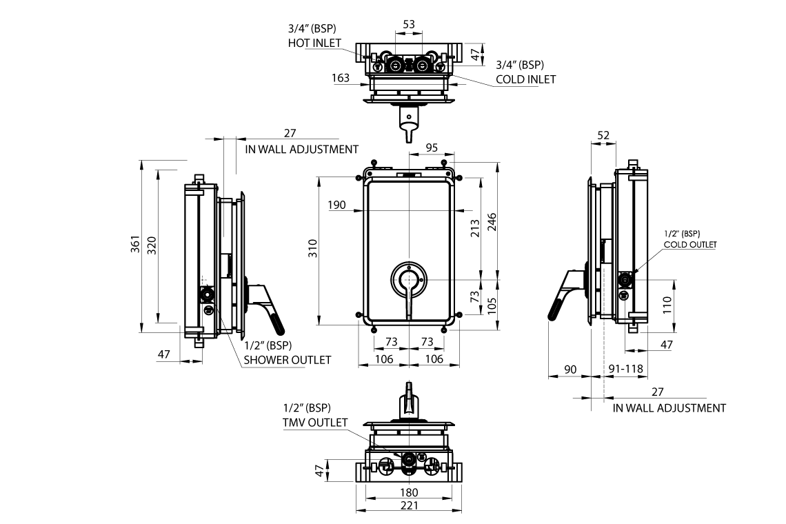 - Point-of Use TMV coupled with a unique 4 way mixer - Supplies mixed and/or cold water to additional fixtures - ideal for Ensuites